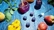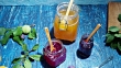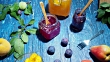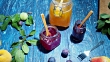 Homemade yogurt with various jams and fresh fruit and berries. Blue background. Top overview