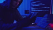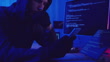 Close up view of a gloved hand holding a smartphone while a hooded figure hacks into a computer system, surrounded by screens displaying code in a darkly lit room with blue and red lights.