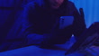 Close up view of a gloved hand holding a smartphone while a hooded figure hacks into a computer system, surrounded by screens displaying code in a darkly lit room with blue and red lights.