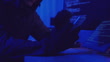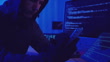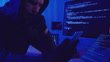 Close up view of a gloved hand holding a smartphone while a hooded figure hacks into a computer system, surrounded by screens displaying code in a darkly lit room with blue and red lights.