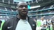 Efe Obada (American football player, Carolina Panthers) set-up shot with reporter and interview SOT