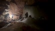 A horizontal shot of a tour guide in an ice cave with an illuminated elephant-like sculpture in the background - 4K stock video