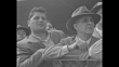 Horses race on track at Jamaica Race Course / GV crowds watch along track with grandstand in background / various shots of racehorse Native Dancer, ridden by jockey Eric Guerin, and other horses parading on track / various shots of men watching in crowd / Native Dancer crosses finish line in first place / Guerin poses on Native Dancer, with crowds standing behind bush in background / various GV of crowds and grandstand / various CU shots of people in crowd / various shots of Guerin posing with Native Dancer / Native Dancer, covered by blanket, is led away