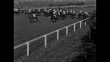 Horses run as Epsom Derby, nicknamed "Coronation Derby" this year begins at Epsom Downs Racecourse in England / WS horses in the back stretch as crowds in center court run to see them pass / men look through binoculars / horses run around curve, pass / rear shot Queen Elizabeth II and royal party watch from royal box / jockey Sir Gordon Richards rides horse "Pinza" to victory, with Queen's horse "Aureole" in second place