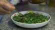 Hot olive oil poured over hummus - 4K stock video