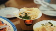 Close up shot of Hotate shell burning with shoyu menu at Hokkaido, Japan