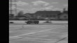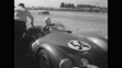 Title: "12-Hour Auto Race -- Two Cars Claim Victory" superimposed over cars racing around curve / cars lined up at stations, mechanics and men walking past / VS Mercedes Benz 300 SL with Venezuela tag ono the front being worked on / older mechanic works on engine of another car / VS drivers put on helmets / drivers run across track and jump into cars and drive off / VS race / men kick bales of hay / car pulls up for pit stop to refuel / cars racing around curve / cars racing on track, two men beside smashed up car on roadside / VS race at night / man waves checkered flag as car crosses finish line / drivers Phil Hill of Santa Monica, CA and Carroll Shelby of Dallas, TX on platform being congratulated, Shelby holds checkered flag / CU 25 on side of car / Pan up to Hill and Shelby / team drivers of car # 19 Phil Walters of Florida and Mike Hawthorne (blond hair) of London (winners) standing next to owner Briggs S. Cunningham (dark shirt, dark hair) of Palm Beach