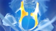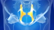 Human skeleton against a blue background, zooming in to the sacrotuberous ligaments, animation