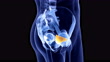 Human skeleton against a black background, showing the ischiofemoral ligament in the hip, animation