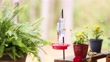 Hummingbirds at a feeder in the springtime. Boston fern and other spring flowers surround the feeder. Two birds come back and forth to the feeder.