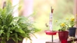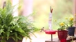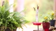 Hummingbirds at a feeder in the springtime. Boston fern and other spring flowers surround the feeder. Two birds are in the clip.