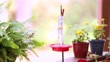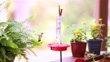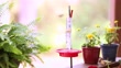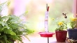 Hummingbirds at a feeder in the springtime. Boston fern and other spring flowers surround the feeder. Two birds in the clip, Camera pans the scene.