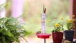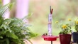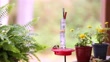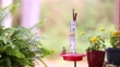 Hummingbirds at a feeder in the springtime. Boston fern and other spring flowers surround the feeder. One watchful bird eating at feeder. She keeps an eye out for other birds. Camera pans scene.