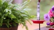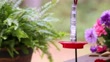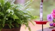 Hummingbirds at a feeder in the springtime. Boston fern and other spring flowers surround the feeder. Male Ruby Red Throat sitting on feeder drinking, then flies off. Camera pans scene.