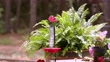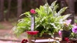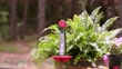 Hummingbirds at a feeder in the springtime. Boston fern and other spring flowers surround the feeder. Camera pans as one bird sits and drinks at the feeder.