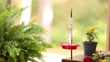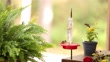 Hummingbirds at a feeder in the springtime. Boston fern and other spring flowers surround the feeder. Also see our stills from this shoot.
