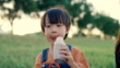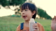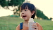Hungry boy drinking milk during family picnic. - 4K stock video