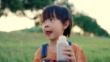 Cute Asian preschooler drinking chocolate milk while sitting on a blanket in the park with mother to relax during the holidays.