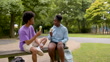 A handheld front view shot of a young man and woman wearing casual clothing sitting together on a bench enjoying ice creams in a public park on a summers day in Newcastle, England.