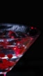 Ice cube is falling into martini glass full of pomegranate drink. Slow motion