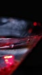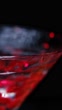 Ice cube is falling into martini glass full of pomegranate drink. Slow motion