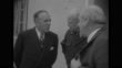 Title: "Ike Says He May Return" superimposed over General Dwight Eisenhower, Ford Foundation President Paul Hoffman and US High Commissioner for Germany John McCloy talking outside NATO HQ / LS NATO headquarters with NATO flag flying from roof / Flags of the United Kingdom, United States, Denmark and three other unidentifiable NATO country flags / Eisenhower, Hoffman and McCloy exiting NATO HQ door and talking / MS photographers kneeling and standing taking photos / MS Eisenhower, Hoffman and McCloy talking and posing for photo op / Note: exact day not known