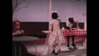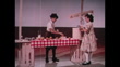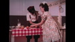 In a studio, a boy is seen cutting a lemon using a knife at a make shift lemonade stand. A girl pours lemonade into a cup using a ladle. The girl walks over to a table to serve another little girl. U.S.A., 1960.