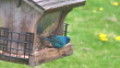 A male indigo bunting eats from a bird feeder.