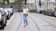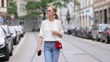 MUNICH, GERMANY - JULY 03: (SLOW-MO) Influencer and model Marlies Pia Pfeifhofer wearing a white mesh pullover by Sweaty Betty, light blue denim jeans pants by Closed, a red bag with a gold chain and large silver crystal by Miu Miu, red loafers by Longcamp, small gold alien hoop earrings by Alina Abegg, a gold ring by Ole Lynggaard Copenhagen, a gold necklace with pearls by Missoma London, a pearl ankle bracelet by Bruna the Label and white frame sunglasses by Celine during a street style shooting on July 03, 2021 in Munich, Germany. (Footage by Streetstyleshooters/Getty Images)