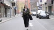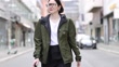 DUESSELDORF, GERMANY - APRIL 19: (SLOW-MO) Influencer Maria Barteczko wearing an olive green nylon jacket by Prada, a white cotton shirt by Cos, black wool pants by Pixie Market, white velcro sneaker by Prada, a black nylon shopping bag by Prada, silver hoop earrings by H&M and black frame oversize Aviator glasses by Victoria Beckham on April 19, 2021 in Duesseldorf, Germany. (Video by Streetstyleshooters#ED FILM/Getty Images)