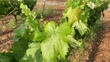 A beetle crawls over a branch leaf in a vineyard on a sunny morning.