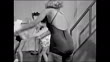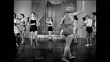 1945: EXERCISE CLASS: HD: Instructor Ms. Chester beating drum as female clients reach & bend over swinging. Clients & instructor going from exercising to dancing Cuban Rumba, WS all in circle doing Rhumba dance steps on dance floor.