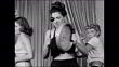 MOT 1945: EXERCISE CLASS: HD: Instructor Ms. Chester beating drum as female clients reach & bend over swinging. Clients & instructor going from exercising to dancing Cuban Rumba, WS all in circle doing Rhumba dance steps on dance floor.