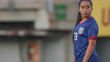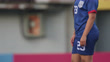 Slow motion tilt up shot of a focused female football player as she gets ready to kick a soccer ball to start the match. She looks to the side at her competition