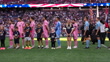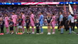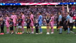 FOXBOROUGH, MASSACHUSETTS - JULY 9: Inter Miami CF players Jordi Alba #18, Tomás Avilés #6, Tadeo Allende #21, Sergio Busquets #5, Oscar Ustari #19 and Lionel Messi #10 stand with young fans while listening to the U.S. National Anthem ahead of the match between New England Revolution and Inter Miami CF at Gillette Stadium on July 9, 2025 in Foxborough, Massachusetts. (Footage by Brian Craig/Getty Images)