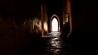 A wide shot of a hallway containing a buddhist statue and doorway inside the temple.