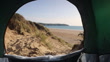 Tent interior overlooking Woolacombe beach with ocean and sand dune