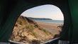 Tent interior overlooking Woolacombe beach with ocean and sand dune