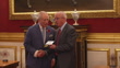 CLEAN: Interior shots of King Charles III presenting the Queen Elizabeth Prize for Engineering to Dr. Bill Dally and Professor Geoffrey Hinton, for contribution to the development of modern machine learning in the field of Artificial Intelligence, at St James's Palace on 5th November 2025 in London, United Kingdom