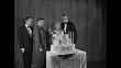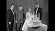 Interior theatre LS on stage people stand behind large cake / MS filmÕs star Frank Lovejoy, General Curtis E LeMay, commander of Strategic Air Command, June Allyson and Jimmy Stewart behind large layer birthday cake / 2-shot Lovejoy & LeMay / 4-shot as Allyson cuts the cake with a sword / LS stage
