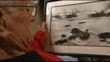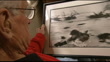 INTHu Riley looking at framed Robert Capa photograph (showing Riley crawling through surf during D-Day landings)
