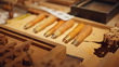 SLO MO - Close-up of intricately carved wooden tools resting on a rustic workshop table. The scene highlights the detailed craftsmanship and organization of the tools, emphasizing the artisanal nature of the workspace.