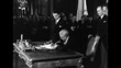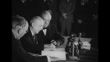 Italian Ambassador Meli Lupi Di Soragna at desk signing peace treaty, aides at chair and others in bg / he rises from chair / pan delegates / delegate signing treaty / delegates and foreign ministers seated at long table, can hear maybe diplomat Georges Bidault speaking / car leaving through gates, men standing around / (voiceover in French begins) maybe Senator Arthur Vandenberg, James Byrnes and Tom Connally seated, aide standing behind lays down treaty in front of one / MS side view of them with one signing treaty / CU Italian treaty title page / treaty is placed before British Foreign Secretary Ernest Bevin to sign, others stand behind / CU Bevin signing / CU Bevin's and another's signatures / LS delegates at table, others standing to side / delegate about to be seated at table / CU side view Bidault / rows of seated reporters, can see notepads / CU Bidault speaking / Italian delegates / delegates at table / CU side view British Ambassador to France Duff Cooper / CU delegates / CU Bidault speaking / minister at desk to sign, aides stand by chair, others in bg / CU side view minister; pan down to signing / maybe Japanese delegate signing / CU ornate clock on salon wall / delegate signing, aides behind and maybe press people in bg / Di Soragna signing / CU treaty