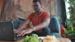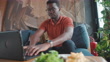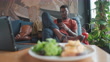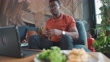 At the coffee shop, modern freelancer, surfing the net on mobile phone, ready to start the work on his Ipad/laptop, while healthy breakfast waiting for him