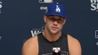 LOS ANGELES, CALIFORNIA - OCTOBER 24: Jack Flaherty #0 of the Los Angeles Dodgers speaks about visiting the Yankee Stadium when he was young during workout day ahead of Game 1 of the 2024 World Series at Dodger Stadium on October 24, 2024 in Los Angeles, California. (Footage by Lucas Mayer/Getty Images)
