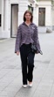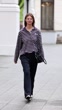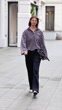 BERLIN, GERMANY - AUGUST 3: (SLOW-MO) Jacqueline Zelwis wears Baum & Pferdgarten stripped long sleeved Polo Shirt, black Anine Bing pants, grey Charles & Keith shoes, Liebeskind Berlin bag on August 3, 2025 in Berlin, Germany. (Footage by Christian Vierig/Getty Images)