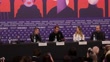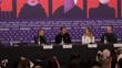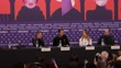 BERLIN, GERMANY - FEBRUARY 22: (L-R) Jalil Lespert, Alexander Skarsgard, Mia Goth, Brandon Cronenberg and Lorenzo Esposito answer questions from the media at the "Infinity Pool" press conference during the 73rd Berlinale International Film Festival Berlin at Grand Hyatt Hotel on February 22, 2023 in Berlin, Germany. (Footage by Christian Ender/Getty Images)