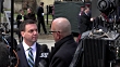 Toronto,Canada: Jim Flaherty State Funeral At Saint James Cathedral. Stephen LeDrew from CP24 interviews PC leader Tim Hudak after the end of the ceremony