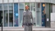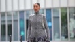 PARIS, FRANCE - OCTOBER 2: (SLOW-MO) Jamilla Strand wears a slicked-back low bun hairstyle with black hair and a center part, silver hoop earrings, a silver ear cuff and a silver ring, a metallic silver chain-strap shoulder bag, a fitted high-neck zip-front grey and black boucle knit top with long sleeves and fringe trim at the waist paired with a matching grey and black boucle knit midi skirt with a front slit and fringe hem, black leather knee-high slouchy boots shoes with a low heel, outside Rabanne, during Paris Fashion Week - Womenswear Spring Summer 2026, on October 02, 2025 in Paris, France (Footage by Edward Berthelot/Getty Images)