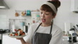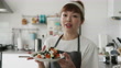 Beautiful Japanese female cook and influencer is doing a virtual cooking class event held at her home studio and broadcasted to her class members online. She cooks Japanese food - temaki and gyoza. Whole series shot with different angles and details.